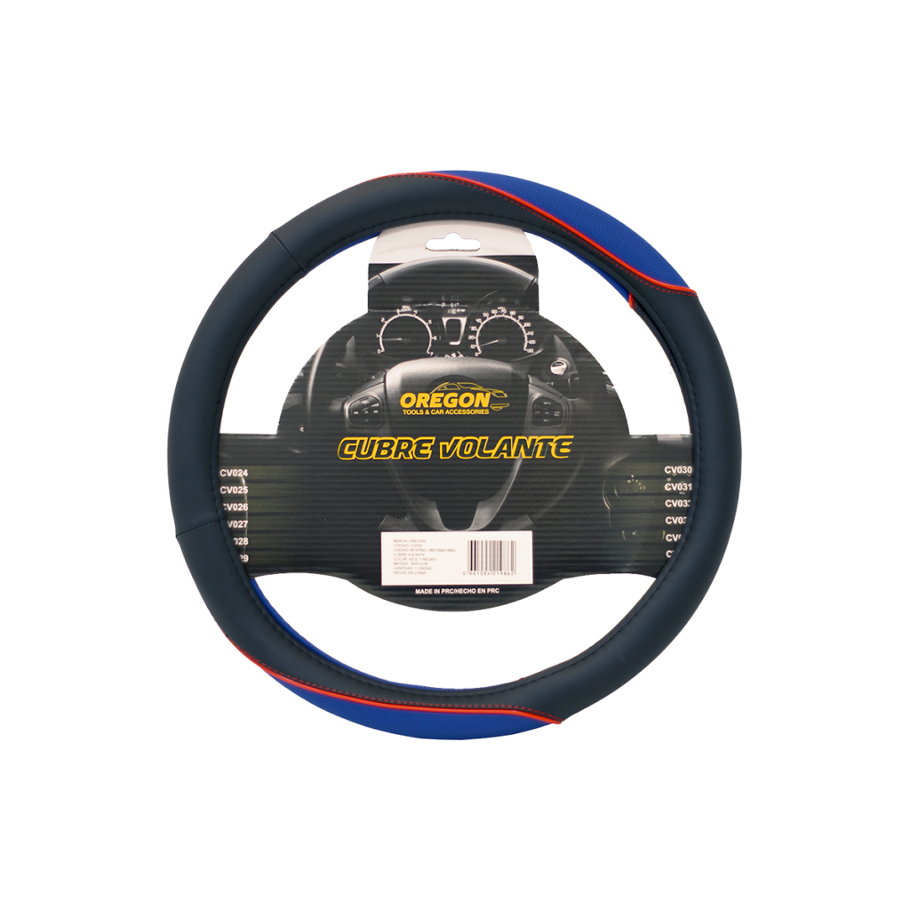 CUBRE VOLANTE 38CM CUERINA NEGRO RAYAS AZUL Y ROJO